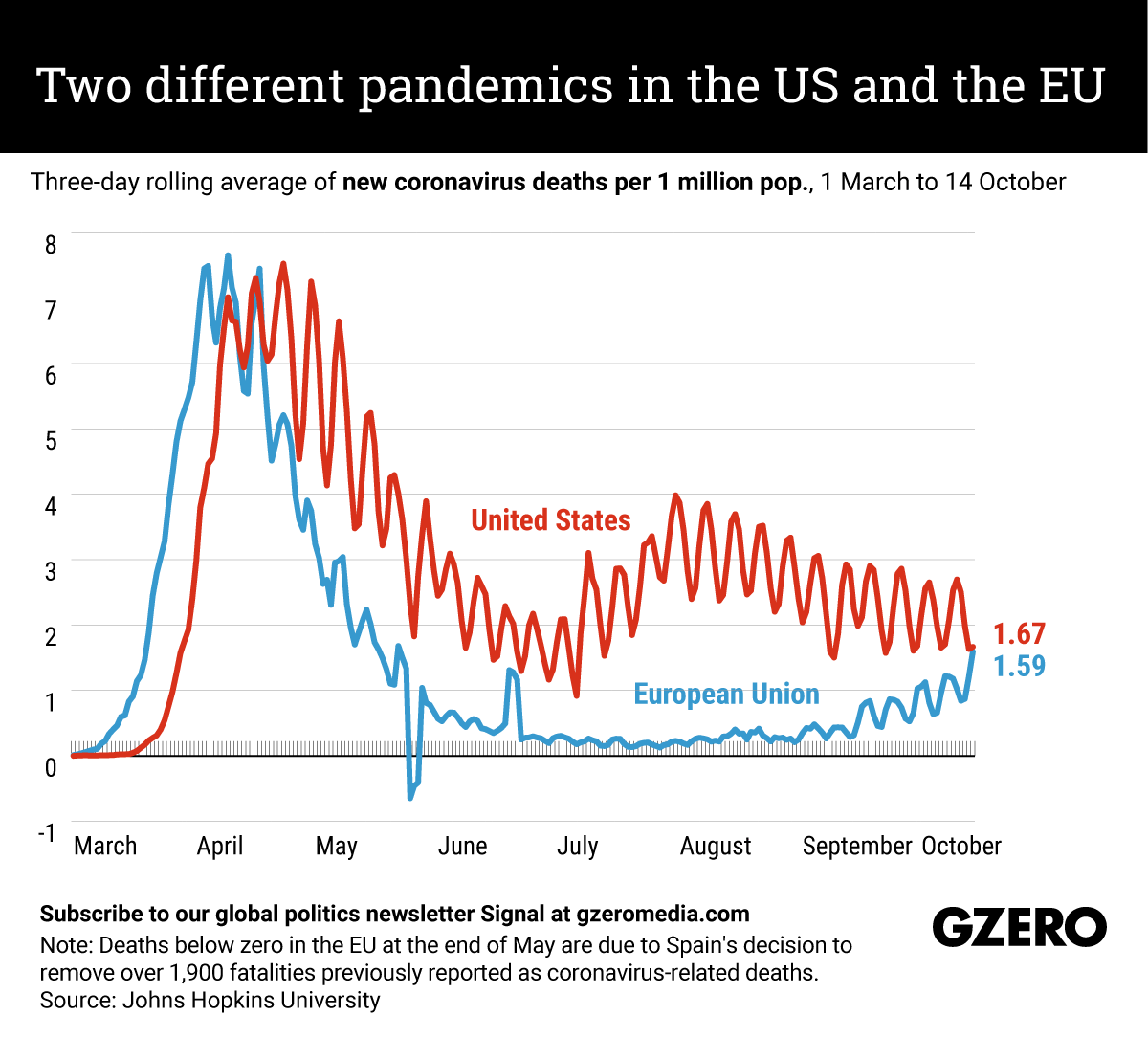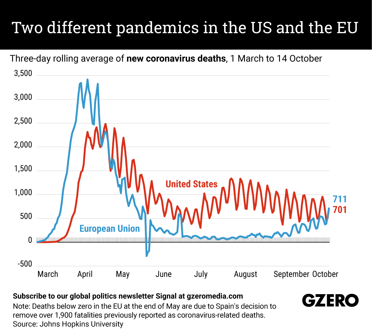 The United States and the European Union have comparable population sizes, but until recently the trajectories of their COVID-19 outbreaks in recent months have been vastly different. As new daily coronavirus cases continue to rise across most US states — prompting worries of a "third wave" in hospitalization rates — many European countries are fighting a full-blown "second wave" of the pandemic that has brought Europe's mortality closer to that of the US, and led more European governments to reinforce strict measures to contain COVID-19. The current situation is a sharp contrast to the disparity seen over the summer, when US cases were spiking across much of the Midwest and South while European countries seemed to have kept the coronavirus (mostly) in check due to stricter adherence to social distancing and mask-wearing. Here's a look at the seven-day rolling average of new COVID-19 cases, and three-day rolling averages of new deaths and new deaths per capita in the EU vs the US since March.