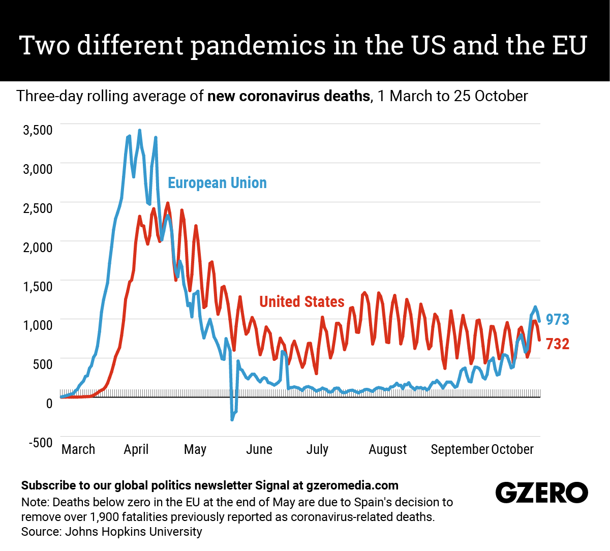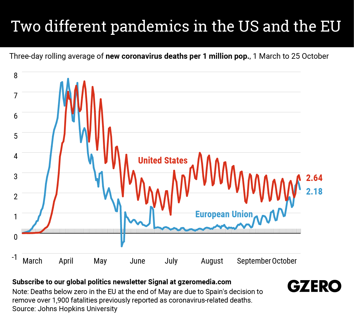 The United States and the European Union have comparable population sizes, but until recently the trajectories of their COVID-19 outbreaks in recent months have been vastly different. In what many medical experts are now calling a "third wave" of the pandemic, coronavirus cases are rapidly increasing across most US states, and over 41,000 Americans are now hospitalized with COVID-19. Meanwhile, most European countries are fighting a full-blown "second wave" that has seen the continent's latest average mortality rates surpass those of the US, and led many European governments to implement fresh restrictions to contain the spread of the coronavirus. The current situation is a sharp contrast to the disparity seen over the summer, when US cases were spiking across much of the Midwest and South while European countries seemed to have kept the coronavirus (mostly) in check due to stricter adherence to social distancing and mask-wearing. Here's a look at the seven-day rolling average of new COVID-19 cases, and three-day rolling averages of new deaths and new deaths per capita in the EU vs the US since March.