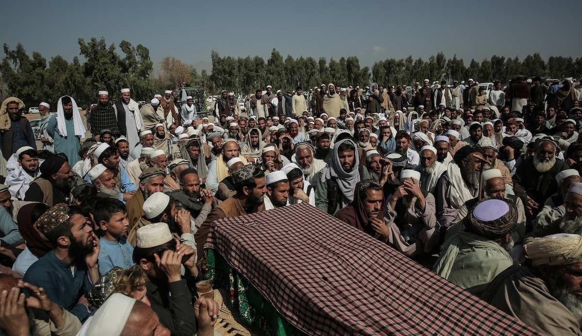 People attend the funeral of a person who was killed in alleged Pakistani airstrikes, in the Ghani Khel district of Nangarhar province.