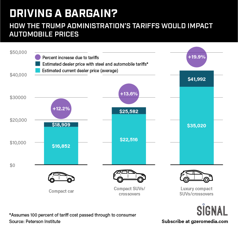 President Trump has proposed tariffs of between 20 and 25 percent on foreign automobiles and auto parts. The plan, now under consideration by the Department of Commerce, would hit American allies who sell into the US market and consumers forced to pay higher prices at the showroom. Here’s an estimate of how average prices for three vehicle models in the US would change if a 25 percent tariff was put in place.