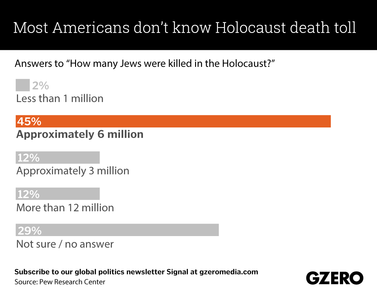 January 27 marks 75 years since the liberation of Auschwitz-Birkenau, the largest Nazi extermination camp. But even as some 40 heads of state gathered in Jerusalem this week to commemorate the six million Jews who were killed, a recent Pew survey revealed that many American adults don't know basic facts about the ethnic cleansing of Europe's Jews during the Second World War. Fewer than half of those polled knew how many Jews were killed in the Holocaust, and close to a third didn't know when it actually happened. Here's a look at some of the numbers.