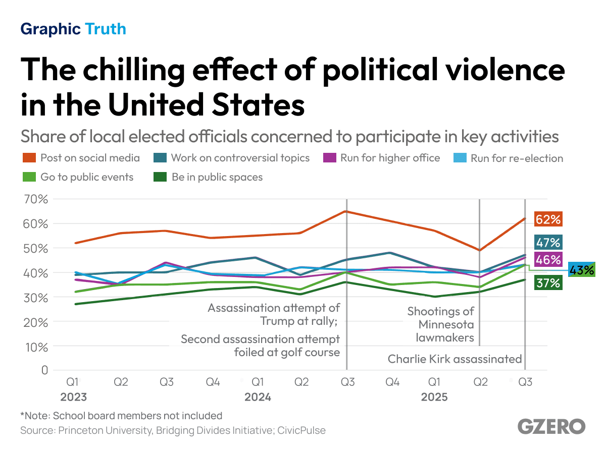 As the Graphic Truth above shows, this has had a chilling effect on local politicians’ willingness to continue holding public office, who frequently have fewer security resources than national-level politicians. During the third quarter of last year, nearly 75% said they were less willing to participate in political activities – including working on controversial issues, posting on social media, or running for higher office – out of fear of hostility, up from 66% in the previous quarter.