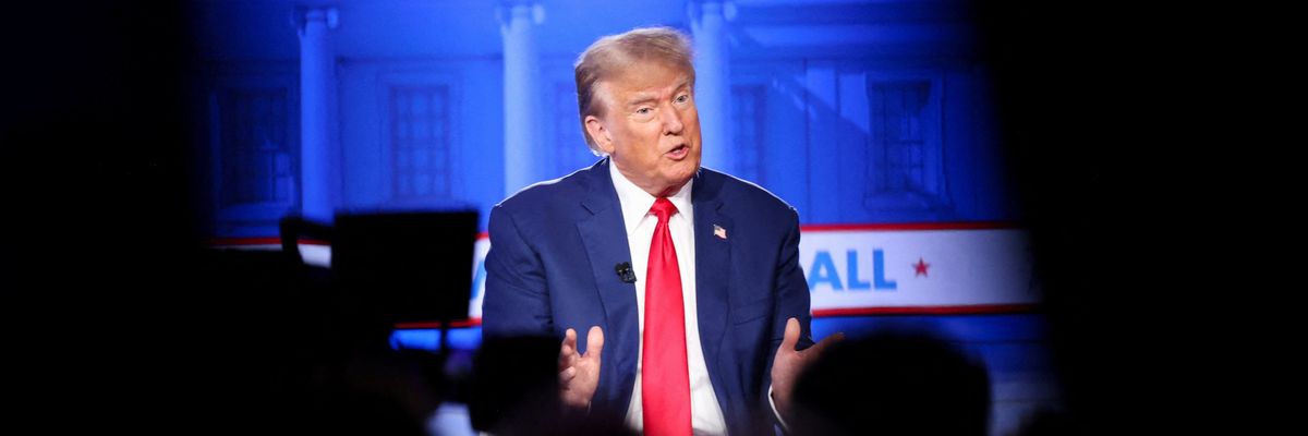 Republican presidential candidate and former US President Donald Trump participates in a Fox News Channel town hall ahead of the caucus vote in Des Moines, Iowa, on Jan. 10, 2024. REUTERS/Scott Morgan