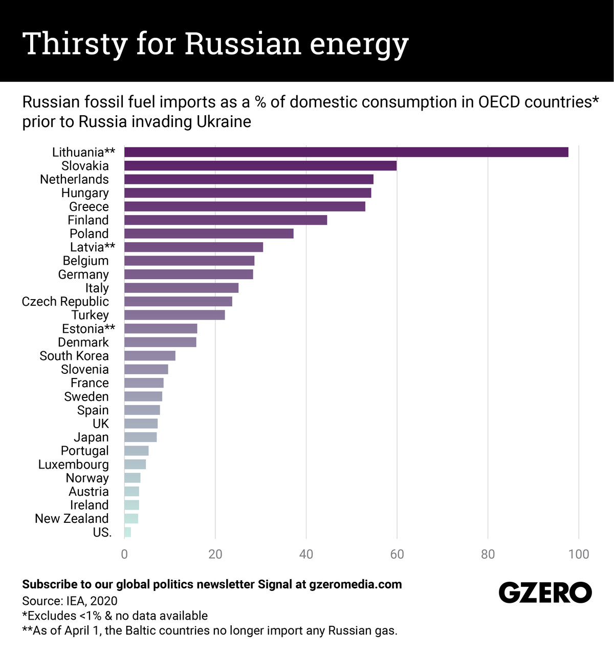 Much of the world has long relied on Russian energy to power their economies. That makes it very hard for them to punish the Kremlin for invading Ukraine by ditching Russia's plentiful oil, natural gas, and coal in the near term. So, who's most dependent on Russian fossil fuels? We look at a select group of OECD economies.
