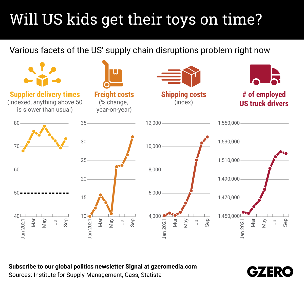 This year, American kids who've asked Santa for L.O.L. Surprise! dolls, Nerf blasters, or classic Legos may be disappointed. The delivery of these and other in-demand toys could be delayed due to pandemic-related supply chain disruptions that are still hitting US businesses and consumers hard. Container vessels loaded with precious cargo are waiting days to enter busy US ports, while within the country truck drivers are working flat out to meet soaring demand for goods of all kinds. Products are getting wildly expensive or arriving late. Here's a snapshot of the problem, showing longer delivery times, skyrocketing freight and shipping costs, and trucker employment.