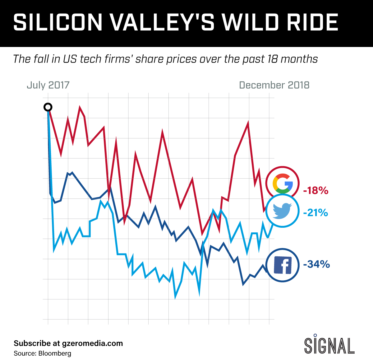 Google's Pichai is just the latest Silicon Valley leaders to travel to Washington to speak with Congress – following trips by the CEOs of Facebook and Twitter earlier this year. The firms in the fastest growing industry in the US have suffered under the weight of calls for heightened regulatory scrutiny and increased sensitivity to the politically disruptive impact of their business models. Here's a look at the wild ride in their share prices over the past 18 months.